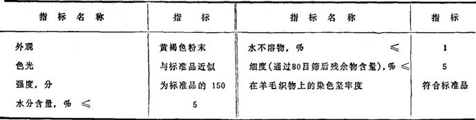 性能 黄色粉末。易溶于水、乙醇、丙酮和溶纤素中,溶于乙醇呈黄色,微溶于苯,不溶于其他有机溶剂。遇浓硫酸呈黄色。其水溶液加10%的硫酸或加氢氧化钠无变化,染色时遇铜离子色泽较红,遇铁离子色泽较暗。拔染性及匀染性均好。 质量规格 HG2-1314-80(见下页表)