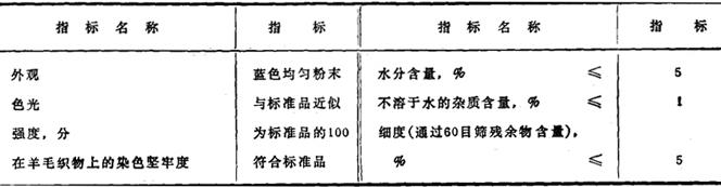 性能 蓝色粉末。易溶于冷水和热水呈蓝色,溶于酒精也呈蓝色。遇浓硫酸呈橄榄色,稀释后呈黄色。水溶液加氢氧化钠在沸腾时由蓝转变为紫色。染色时遇铜、铁离子色泽变暗。对重铬酸不敏感。 质量规格(津Q/HG2-557-78)