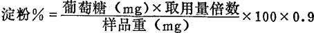 | 释义 | 酸水解法 (一)适用范围 淀粉在稀酸(1%HCl)作用下,水解成糊精和麦芽糖,最后转化成葡萄糖,然后测定葡萄糖,推算淀粉含量。本法较快速,但在酸水解淀粉同时,某些多糖也可同时水解,故适于一般的测定。要求严格时可用酶水解法。 (二)试剂配制 (1)10%NaOH。 (2)饱和Na2SO4。 (3)甲基红指示剂。 (4)1%HCl:23ml浓HCl加水至1L。 (5)10%中性Pb(OAc)2:100gPb(OAc)2溶于1L水中,过滤。 (6)I2-KI溶液:2gKI溶于5m1水中,再加入1gI2,加水至1L,保存于棕色瓶中。 (三)测定步骤 称取风干磨细并通过60目筛的样品1.000-2.000g(如含脂肪多的样品,则须预先脱脂),放入250ml三角瓶中,加入1%HCl150ml,用具有长玻管的塞子塞紧,在沸水浴上加热(也可放入105℃烘箱中代替),加热过程中须不时摇动,并注意三角瓶内的液面须浸入沸水中,同时切勿使三角瓶底直接接触水浴锅底,以免跳动或样品焦化。经过3-4b后,取出试液少许,检查是否水解完毕。其作法是:用皮头滴管吸取少许带固体颗粒的悬液,放在白瓷板上,加2滴I2-KI溶液,如固体颗粒不显蓝色,红色或紫色,说明水解已完全。所取溶液须无损地倒回三角瓶中,并用少量水冲洗滴管,洗液全部收集在三角瓶中(也可于玻片上用低倍显微镜观察其颜色)。如水解不完全,应继续加热半小时后再进行检查,直到水解完全为止。 水解结束后,冷至室温,加入甲基红3-4滴,用10%NaOH中和至微黄色为度。然后逐滴加入10%中性Pb(OAc)2约5-10ml,以沉淀蛋白质。静置片刻,待上部清液澄清后,再加入几滴Pb(OAc)2溶液,检查蛋白质是否沉淀完全。继续滴加Pb(OAc)2溶液直至无白色絮状沉淀产生为止。 将水解液过滤入250ml容量瓶中,用水洗涤三角瓶和沉淀数次,滤液全部收集于容量瓶中,加水定容。 用吸管吸取50ml清液于100ml容量瓶中,逐滴加入5-7ml饱和Na2SO4溶液,以除去过量的醋酸铅,至不再产生白色PbSO4为止,加水定容后过滤。此即由淀粉水解而得到的葡萄糖溶液。可吸取适当量,用二十七章的别尔特朗法、铜还原直接滴定法测定其中还原糖,然后推算淀粉含量。 (四)结果计算