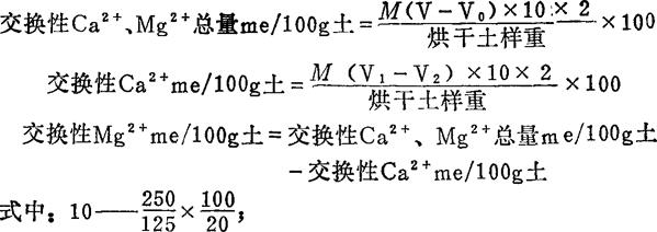 | 释义 | 醋酸铵-EDTA容量法 1.适用范围 EDTA测定钙、镁的工作范围钙为0.5-5.0ppm,镁为0.5-3mg。 2.试剂配制 (1)pH10缓冲液:取67.5gNH4Cl溶于200ml水中,加570ml浓氨水,用水稀释至1L,注意防止CO2的侵入。 (2)EDTA标准溶液(0.01mol):取3.720gEDTA二钠盐溶于无CO2的蒸馏水中,微热溶解,冷却定容至1L。用标准Ca2+盐或Mg2+盐标定之。若试剂为分析纯,可精确称取定容后不必再标定。此液最好贮于塑料瓶中,否则浓度易变。 (3)Ca2+标准液:准确称取在105℃下烘4-6h的分析纯CaCO30.5004g,溶于25ml0.5NHCl中,煮沸除去CO2,用无CO2蒸馏水洗入500ml容量瓶,并稀释至刻度。此液浓度为0.0100MCa2+标准液。 (4)2N氢氧化钠:称取NaOH80g,溶于1L蒸馏水中。 (5)铬黑T:同醋酸铵法测交换量中本试剂的配制法。 (6)钙指示剂(依来铬蓝黑R,CaKOn):称取钙指示剂0.02g,溶于50ml甲醇中,此液不能放置很久。 (7)三乙醇胺。 (8)5%盐酸羟胺:称取盐酸羟胺5g溶于100ml蒸馏水中。 3.测定步骤 将1N醋酸铵法测定交换性盐基总量后已定容至100ml的溶液,吸取四份,每份20ml,分别置于小三角瓶中。 取两份测Ca2+、Mg2+总量:各加pH10缓冲液20ml,使溶液达到pH10(用广泛pH试纸检查)。再加三乙醇胺1ml,盐酸羟胺2ml,铬黑T10滴,摇匀后加热至40℃左右。用标准EDTA滴定至溶液由红变为蓝色为止(V)。同时进行空白试验,钙、镁总量空白试验所消耗的EDTA毫升数(V0)。 另取两份测Ca2+:各加2ml2NNaOH,使溶液达到pH12以上。再加上三乙醇胺1ml,盐酸羟胺2ml,钙指示剂5滴。使溶液加热至40℃左右,用标准EDTA滴定至由红色变为蓝色为止(V1)。同时进行空白试验,钙空白试验所消耗的EDTA毫升数(V2)。 4.结果计算