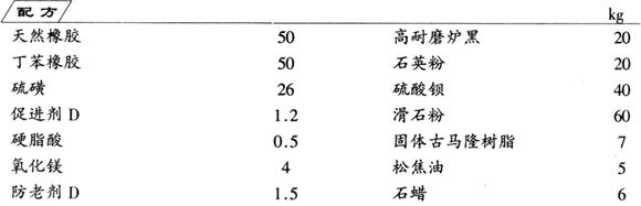先将天然橡胶、丁苯橡胶和促进剂D混合,进行塑炼,再加入其余全部组分进行混炼,薄通,得到胶料。按采煤电机橡胶衬里工艺成型,经硫化,制成制品。
