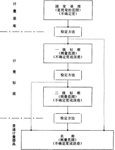 | 释义 | 量值传递 量值传递系指通过计量检定或校准,将计量基准所复现的计量单位(或其倍数或分数)逐级传递给各级计量标准直至普通(工作)计量器具的活动。 为使量值合理、有效地传递,确保量值的准确统一,正式的量值传递工作必须按照《国家计量检定系统》进行。 国家计量检定系统(过去曾称为量值传递系统),是由国务院计量行政部门组织制定的全国性技术法规,其中用图表结合文字的形式,明确地规定由国家计量基准到各级计量标准,直至普通计量器具的量值传递程序,包括名称、测量范围、精确度(或不确定度)和检定方法等。 图1.4-1所示的是国家计量检定系统的框图格式。