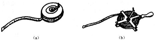 (a)钢尺卷在圆形金属盒内;(b)钢尺卷在金属尺架中