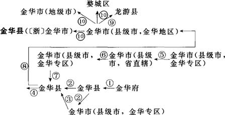 ①1912年改金华府为金华县。②1949年12月20日,析金华县城区置金华市(县级市),乡村仍为金华县,实行市县分治。③1950年5月撤销金华市,并入金华县。④1951年7月重设金华市(县级市),实行市县分治。⑤1954年金华市(县级市),由省直辖。⑥1958年金华市(县级市),隶金华专区。⑦1962年12月22日撤销金华市,再次并入金华县。⑧1981年1月撤销金华县,改设金华市(县级市),隶金华地区。⑨1983年9月析湖镇区划归龙游县。⑩1985年5月金华市升格为地级市;原金华市(县级市)辖区析城区及城郊13个乡成立婺城区;余为金华县辖区。