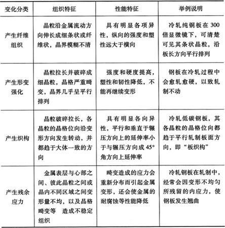 | 释义 | 金属材料轧制组织及性能 (一)冷轧金属组织和性能 金属铸锭在冷态下经过轧制成型为各种规格的型材过程中,其组织和性能将发生一系列重大变化,这些变化大致可以分为表7-8中的4种变形特征。 表7-8 冷变形金属组织和性能的变化特征