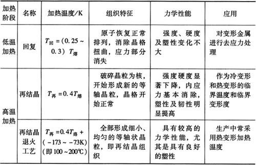 (二)冷轧金属加热时组织及性能 综上所述,通过冷塑性变形,不仅使金属的晶粒破碎拉长,而且还会使晶格扭曲,内能增加,从而使金属产生形变强化、织构和残余应力,既使金属继续变形造成困难,又使金属内部处于一种不稳定状态,将引起一系列的性能变化。所以,金属在塑性变形之后或在其加工变形过程中都需要退火,即对金属进行一定温度的加热,使其组织从不稳定的状态趋于稳定状态,性能得以恢复,如表7-9和图7-3所示。 表7-9 变形金属在不同加热温度时的组织和性能