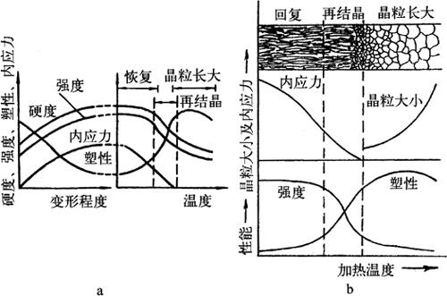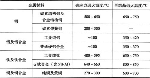 图7-3 变形金属在不同加热温度时组织和性能的变化 a.冷变形与温度和性能的关系 b.形变组织与性能的变化 由图7-3可知,金属再结晶晶粒大小对其性能影响很大,加热温度越高,保温时间越长,再结晶晶粒越粗大,强度与硬度越低。因此,生产中要控制好金属的再结晶温度(表7-10)。 表7-10 常用金属材料的再结晶退火和去应力退火温度