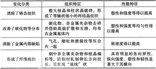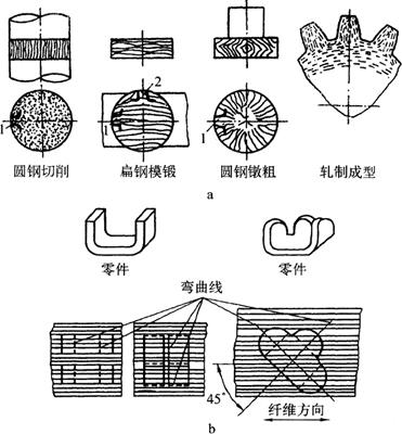 表7-11中纤维组织的明显程度与金属的变形程度有关;变形程度越大,纤维组织越明显,纤维组织的稳定性很高,不能用热处理方法加以消除,只有经过锻压使金属变形,才能改变其方向和形状(图7-4a)。
