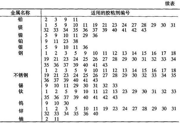| 释义 | 金属的胶接 (1)同种金属胶接适用的胶粘剂 如表8-23所示. 表8-23 同种金属胶接适用的胶粘剂