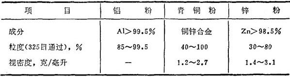 | 释义 | 金属粉 【释文】: 性质与用途 金属粉一般有铝、青铜、锌、铜、铅等粉末,系由熔融金属喷雾或金属碎片、箔片机械粉碎而得。表9-11为常用金属粉的性质。 表9-11 常用金属粉的性质
