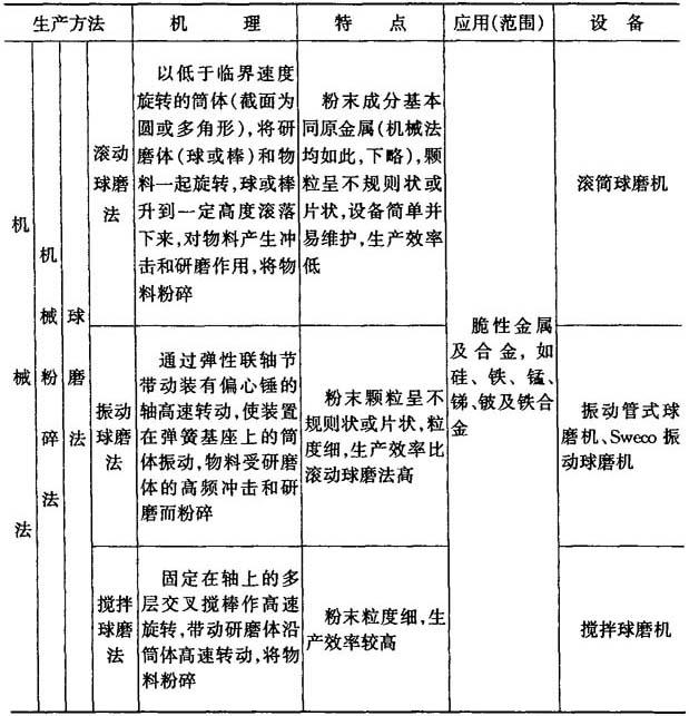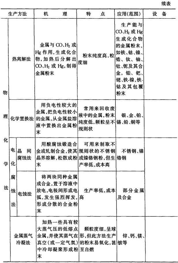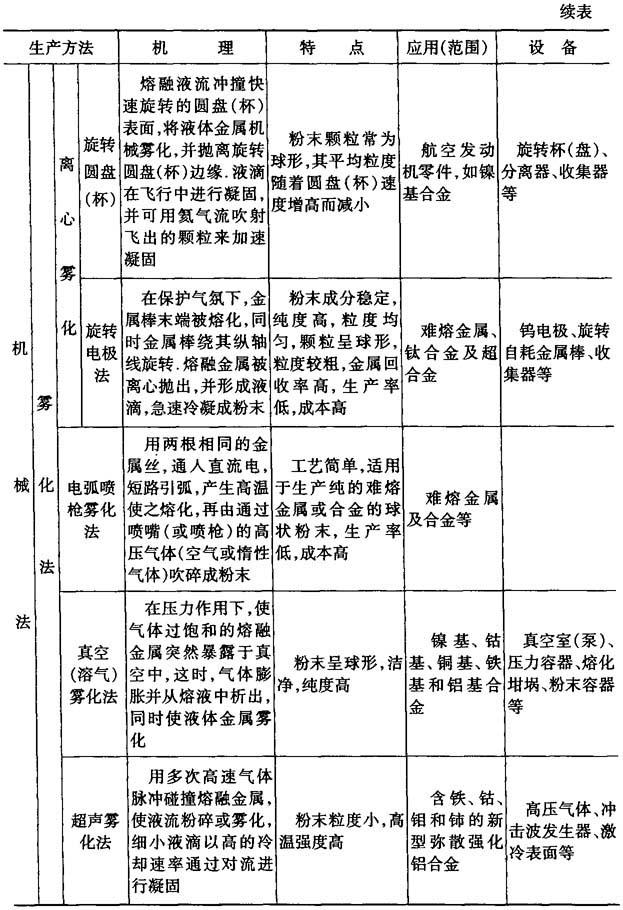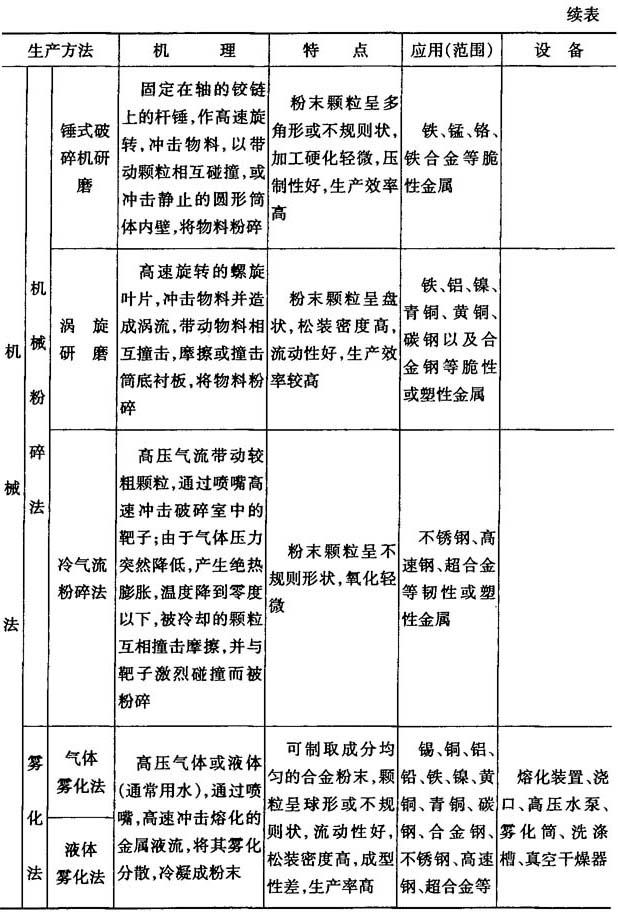 | 释义 | 金属粉末生产方法 同一种金属,用不同的生产方法,可以制得成分、物理性能和工艺性能均不同的金属粉末,它们的应用范围也不同,制取金属粉末的方法分为机械法和物理化学法两大类,表6-2列出了各种生产方法的机理、特点、应用(范围)及主要设备. 表6-2 金属粉末生产方法的机理、特点、应用(范围)及主要设备