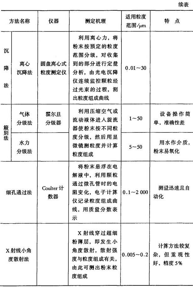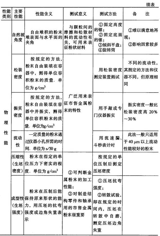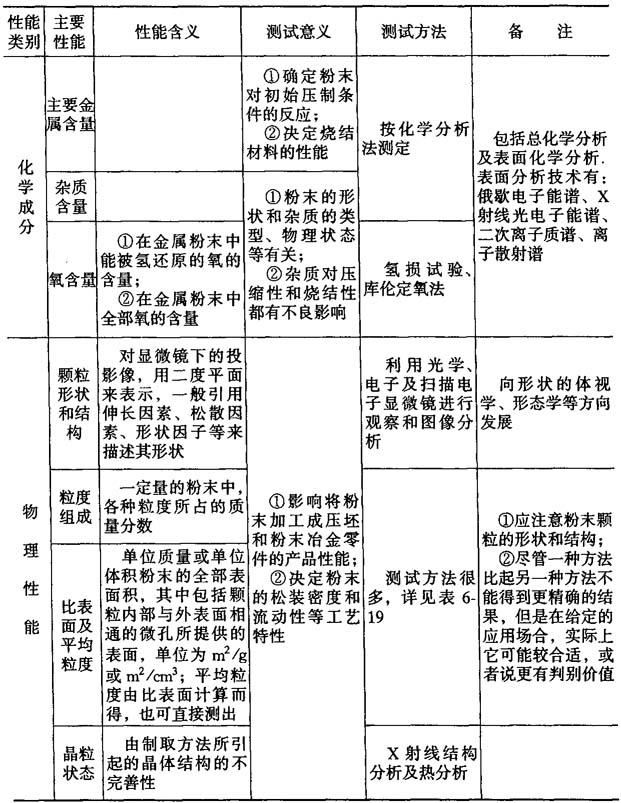 粉末冶金制造工艺的成就,在很大程度上取决于对金属粉末的单个颗粒和粉末体的物理和化学性能的了解和评定,表6-18列出了金属粉末各项主要性能、测试意义和测试方法.