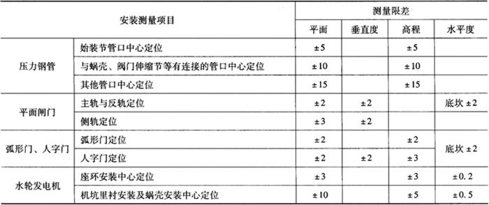 | 释义 | 金属结构与机电设备安装测量 1.一般规定 1)水电水利工程金属结构与机电设备安装测量工作内容包括:测设安装专用网或安装轴线与高程基点;安装点的放样;安装竣工测量等。 2)金属结构与机电设备安装轴线和高程基点应埋设稳定的测量标志,一经确定,在整个施工过程中不宜变动。 3)安装放样点测量限差见表13-5。 表13-5 安装放样点测量限差 m