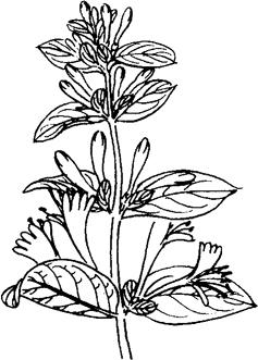 图2-32 金银花 (1)植物学特征。金银花忍冬科,忍冬属,半常绿藤本灌木。在我国分布极广,北起辽宁,南至云、贵,都有栽培。日本、朝鲜等国也有分布。单叶对生,卵圆形,两性花,成对腋生;花冠2唇形,先白色,后变淡紫色,后转黄色,有香味。花期5~7月;浆果球形,黑紫色;果熟期10月。 (2)对环境与土壤的要求。金银花喜光、耐阴、耐寒,不择土壤。但在肥沃的砂质壤土中生长最好。 (3)施肥技术。金银花施肥比较简单,田间栽植时,春季开花前,要施足基肥,花后应追施以氮为主的肥料。盆栽时,保持盆土湿润,经常浇灌有机肥发酵泡制的肥水即可,一般1周浇1次为宜。 |