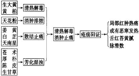 【要点】 热毒所致疮疡者,乃由于局部之郁结气血痰也。本方在大黄、黄柏清热解毒的基础上,用平胃散化浊,姜黄、白芷、天南星温行气血以散结,切合病机。天花粉一味为疮家要药,脓未成可消,脓已成可排,清热护阴,面面俱到。 【应用】 各种皮肤及软组织感染症初期,尚未溃脓者。 【注意】 脓成已溃者禁用。 |
