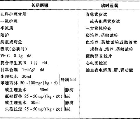 说明:1.抗生素的疗程3~4周;若细菌培养结果为耐甲氧西林金黄色葡萄球菌(MRSA),应选用万古霉素40mg/(kg·d),分次使用。 2.支持疗法,可少量多次输注全血或血浆,或静脉滴注丙种球蛋白。 3.中毒症状明显时,在强力抗生素的基础上使用糖皮质激素,疗程3~5天。 4.并发心力衰竭时,洋地黄剂量宜偏小。 5.注意复查胸片,并发脓胸应及时穿刺抽脓或行胸腔闭式引流。 6.注意并发症处理。 |
