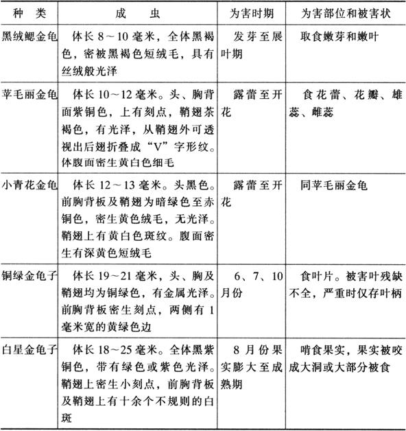 | 释义 | 金龟子类 为害苹果的金龟子类,常见的有黑绒鳃金龟、小青花金龟、苹毛丽金龟、铜绿金龟子、白星金龟子5种。这5种成虫的识别特点如表1-6: 表1-6 黑绒鳃金龟、小青花金龟、苹毛丽金龟、铜绿金龟子、白星金龟子成虫识别特点