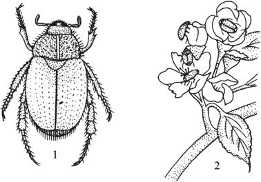 图1-17 苹毛金龟子 1.成虫 2.被害状 成虫:体长19~21毫米,宽9~10毫米。体背铜绿色,有光泽。前胸背板两侧为黄绿色,鞘翅铜绿色,有3条隆起的纵纹。 卵:长约40毫米。椭圆形,初时乳白色,后为淡黄色。 幼虫:长约40毫米,头黄褐色,体乳白色,身体弯曲呈“C”形。 蛹:裸蛹。椭圆形,淡褐色。 成虫:体长20~24毫米,宽11~14毫米。全体黑铜色,前胸背板、腹部两侧和鞘翅上散布许多不规则白斑。 卵:长1.7~2.0毫米,椭圆形,乳白色。 幼虫:长20~39毫米,弯曲成“C”形。头部褐色,胴部乳白色,肛腹片上刚毛呈“U”形。 蛹:裸蛹。卵圆形,长20~23毫米,黄白色。 【发生规律】: 每年发生1代,以成虫在土中越冬。早春出土,先在荒草地取食刚发芽的杂草及榆、杨、柳树的嫩芽。苹果发芽时,转移到果园,先在果园边行为害,逐渐迁入果园中,夜间和上午都潜伏在土中,15时之后,陆续上树为害嫩芽,22时左右又入土潜伏。成虫产卵在荒草地,幼虫取食杂草。 一年发生1代,以成虫在土中越冬。第二年4月上旬果树萌芽期,当平均气温达到11℃以上时,越冬成虫即出土为害,成虫最早为害柳树、杨树和榆树的嫩枝,并有群集为害的习性,随后,当果树开花时,转移至果树上,啃食杏、梨、苹果的花蕾、花及嫩叶。苹果、梨的初花期是其为害盛期。4月下旬入土产卵,散产,每雌可产卵10~30粒,卵经27~31天孵化为幼虫,5月底至6月初为幼虫孵化盛期。8月中下旬幼虫老熟在土中化蛹。9月上旬羽化为成虫。当年不出土,即在土中过冬。成虫早晚不活动,中午前后气温上升时活动。成虫有假死性。 每年发生一代,以3龄幼虫在土内越冬,第二年春季土壤解冻后,越冬幼虫开始上升移动,5月中旬前后继续为害一段时间后,取食农作物和杂草的根部,然后,幼虫作土室化蛹,6月初成虫开始出土,为害严重的时间集中在6~7上旬,7月份以后,虫量逐渐减少,为害期为40天。成虫多在傍晚6~7时飞出进行交配产卵,8时以后开始为害,直至凌晨3~4时飞离果园重新到土中潜伏。成虫喜欢栖息在疏松、潮湿的土壤中,潜入深度一般为7厘米左右。成虫有较强的趋光性,以20~22时灯诱数量最多。成虫也有较强的假死性。成虫于6月中旬产卵于果树下的土壤内或大豆、花生、甘薯、苜蓿地里,雌虫每次产卵20~30粒,7月间出现新一代幼虫,取食寄主植物的根部,10月中上旬幼虫在土中开始下迁越冬。 每年发生1代,以幼虫在土中越冬。6~7月发生较多,一般6月中旬后,苹果膨大期受害最重。成虫喜食成熟的果实,常数头或10余头聚集在果实或在树干上的烂皮凹穴部位吸取汁液,这种现象在雨后更常见。成虫每日活动时间在10时到下午3~4时,受惊后即迅速飞起。成虫对糖醋或果醋有趋性,可利用此习性进行诱杀。卵产在土内或粪土堆里,孵化的幼虫即生活在其中。幼虫基本不食正在生长的植物根系,专食腐殖质。 幼虫老熟后,即吐黏液混合土或沙砾结成土室,并在其中化蛹,土室一般离表土16~23厘米,从结土室到化蛹约需1周,羽化后,仍在土室内经过7~10天,土室对白星金龟子有保护作用,破坏了土室,在自然条件下,极易被蚂蚁、步甲等天敌捕食。实践证明:无土室的幼虫不能化蛹,无土室的蛹不能羽化。 【防治方法】: (1)套袋阻隔 用旧报纸或塑料薄膜做成袋,套在幼树的中央及主、侧枝端部,可保护芽眼免受其害,此法适于新植果树和幼树。注意及时取下此袋,以免嫩芽、嫩叶黄化而影响生长。 (2)人工诱杀 在果园中,于黄昏时分插杨树枝条(事先浸好农药)6~7根一捆,进行诱杀。 (3)果园养鸡 可作为鸡饲料。 (4)黑光灯诱杀 利用其成虫的趋光性,用黑光灯诱杀。 (5)树上喷药防治 苹果发芽期喷50%辛硫磷乳油1000倍液,40%乐果800倍液,20%杀灭菊酯乳油3000倍液,均可收到良好效果。 (6)地面防治 在特别严重的地区,在喷药的情况下,还应做好地面防治。在果园周围几行进行土壤施药。每公顷用50%辛硫磷、敌百虫粉剂15~30千克与沙土混合后均匀撒在地面并松土混合,此法效果很好。 2.苹毛丽金龟 苹毛丽金龟和小青花金龟均为苹果开花前后为害的种类。成虫啃食花蕾、花瓣、雌蕊、雄蕊,下面仅就苹毛丽金龟为例说明。 苹毛丽金龟属鞘翅目,金龟子科。分布广,主要为害区域是:黄河故道地区、河北、山西、山东、甘肃等苹果产区。食性很杂,除为害苹果、梨、桃、葡萄、李、杏外,还为害其他作物和树种。 (1)早晚震树,捕杀成虫。 (2)避免在果园周围栽植杨、柳树,以防恶化其生活环境,可减轻为害。 (3)在果树现蕾至开花前药剂防治,药剂种类及浓度同黑绒鳃金龟。 3.铜绿金龟子 铜绿金龟子属鞘翅目,金龟子科,又称铜绿丽金龟。发生普遍,以黄河故道果区最严重,食性杂,主要寄主有:苹果、梨、桃、李、葡萄、核桃、山楂等,其中以苹果属果树受害最重,成群聚集树上取食,严重影响幼树的生长。 (1)利用趋光性诱杀成虫 铜绿金龟子成虫趋光性很强,可用黑光灯诱杀,晚间8~10时开灯即可。 (2)利用趋化性诱杀成虫 铜绿金龟子成虫对糖醋液和酸菜汤有明显的趋性。 (3)在果园内尽量不种大豆、花生、甘薯、苜蓿,不施未经腐熟的有机肥。 (4)成虫发生期喷药防治,药剂种类和浓度同黑绒鳃金龟。 4.白星金龟子 白星金龟子属鞘翅目,金龟子科,又名白星花潜,广布我国大江南北,寄主植物有:苹果梨、桃、葡萄等。成虫不仅咬食幼嫩的芽叶,也能蛀食果实,特别喜食有病虫伤斑的果实。 (1)捕杀成虫 可用捕虫网将群
