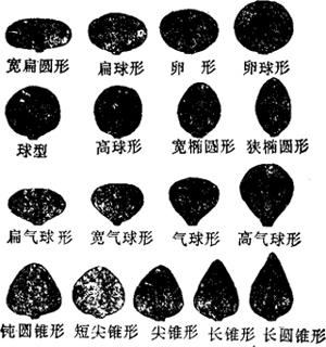 (1)形状 分扁圆形、球形、椭圆形、尖锥形等17种(如图28-1)。