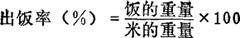 (6)米色 分琥白、乳白、红、紫黑等色。 (7)米质 根据腹白大小、心白大小、色泽、碎米率等项综合评定。分上、中、下三级记载。 (8)胀性测定 以出饭率表示之。除去杂质及碎米的样品,用1/100g天平称取每份重40g试样3份,分取放入250ml已称重的烧杯(或搪瓷杯)内,并按下列标准用量筒加入清水(毫升): 糯米:60、70、80 粳米:70、80、90 籼米:85、95、105 加水后分别放入已煮沸的蒸笼中蒸煮40分钟,再闷10分钟后取出,立即盖以表面玻璃,防止水分散失和饭面硬结,冷却至室温后称重。最后在几份样品中选出一份硬软适中的饭样测算之: