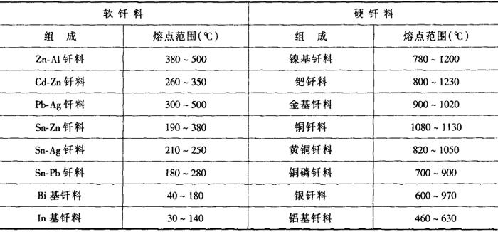 根据组成钎料的主要元素,软钎料分为铋基、铟基、锡基、铅基、镉基、锌基等;硬钎料分为铝基、银基、铜基、锰基、金基、镍基等不同类型;各类钎料的熔化温度范围如表1-9-11所示。