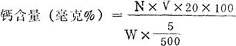 式中:N:高锰酸钾标准溶液的当量浓度; V:滴定所消耗高锰酸钾标准溶液的量(毫升); W:样品重(克); 20:1N高锰酸钾标准溶液1毫升相当于钙的量(毫克)。 〔注〕用高锰酸钾滴定时需不断振摇,使溶液均匀。 |