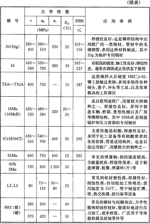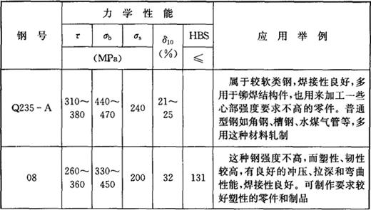| 释义 | 钢材的分类 钢在冶炼后,将钢液浇入钢锭模内铸成钢锭,钢锭除一部分用于大型锻件外,大部分经过轧制而成各种钢材,以供使用。按钢材横断面的形状特征来分,可分为板材(钢板)、型材(型钢)、管材(钢管)和线材(钢丝)四大类。 1.板材 板材是铆工接触最广泛的原材料之一,常用于制造容器、机体、壳体和其他钢结构。 按板材的厚度,钢板可分为以下三种。 (1)薄板 厚度在0.2~4mm之间,宽度通常在0.5~1m之间。 薄板又有热轧和冷轧之分,冷轧板表面光洁,尺寸精确,综合力学性能较好。 热轧板是在高温状态下轧制而成的,沿轧制方向存在着纤维组织,使板材纵、横向的力学性能不同。例如,在顺纤维方向的抗拉强度明显高于垂直纤维方向的抗拉强度;而垂直于纤维方向的抗剪强度却高于顺纤维方向的抗剪强度等等。 薄板常用来制造机罩、机壳、水箱、油箱和冲制器皿、器具等。在汽车、航空、电气和机械工业等部门及日用品方面,都获得广泛应用。 (2)中厚板 厚度在4~20mm之间,宽度通常在1~2m之间。 (3)厚板 厚度在20mm以上,宽度通常在0.6~2m之间或更宽。 中厚板和厚板,按其用途分普通钢板、锅炉钢板、压力容器钢板、造船钢板和特殊钢板等。例如,Q235-A、16Mn为普通钢板和普通低合金钢板牌号;20g为锅炉钢板牌号。“g”字母为“锅”字汉语拼音的第一个字母,表示锅炉用钢板;A3R、16MnR则为压力容器用钢板,“R”为“容”字的汉语拼音的第一个字母;船用钢板的代号为“C”,加在钢材牌号的后面,如12MnC、16MnC等。而桥梁钢板的代号为“q”,如12Mnq、15MnVq等。 表8-1列出了部分常见钢材的力学性能和用途。 表8-1 部分常见钢材的力学性能和用途