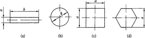 图8-1 几种简单几何形状的型钢断面及尺寸表示方法 (a)扁钢a×b;(b)圆钢Φ;(c)方钢a;(d)六角钢a 图8-2(a)所示为角钢的断面图形。角钢分等边角钢和不等边角钢两类。角钢的规格用边长和边厚的尺寸来表示。等边角钢标记方法为