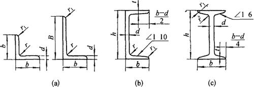 图8-2 角钢、槽钢、工字钢断面及各部位尺寸 (a)角钢;(b)槽钢;(c)工字钢 槽钢分热轧普通槽钢、热轧轻型槽钢和普通低合金轻型槽钢三大类。其断面形状如图8-2(b)所示。图中h为槽钢的高度,b为翼板宽,d为腹板厚,t为平均翼板厚。r为内面圆角半径,r1为边端圆角半径。 槽钢的型号以代表槽钢高度的数字表示,单位为cm。例如10号槽钢,其高度h为100mm。 槽钢的标记方法是,若槽钢的高为400mm,翼板宽102mm,翼板厚12.5mm的热轧普通槽钢,其标记为:槽钢40b或 工字钢分热轧普通工字钢、热轧轻型工字钢和普通低合金热轧工字钢三大类。其断面几何形状如图8-2(c)所示。图中h为工字钢的高度,b为翼宽,d为腹板厚度,t为平均翼厚,r为内面圆角半径,r1为边端圆角半径。 工字钢规格的表示方法也是以号数表示,号数表示工字钢的高度,翼宽和高度有一定的比例。如10号工字钢,其高度h为100mm。 工字钢的尺寸标记方法:若普通工字钢的高为200mm,翼板宽100mm,腹板厚7mm,其标记为工字钢20a或I20a。 角钢、槽钢、工字钢一般采用的材料是:Q235等普通碳素结构钢。也有用普通低合金钢的,如16Mn等。近年来,由于科学技术的不断进步,对型材也提出了更高的要求,一些中、高合金和特殊材质的型钢,也在不断问世。 4.线材 线材即是钢丝。钢丝通常是用热轧线材(盘条)为原料,经冷拔加工而成的。 常见钢丝的断面形状多为圆形。 钢丝的断面直径可以做得很细(<0.1mm),也可以做得很粗。前面介绍过的碳素钢、合金钢以及特殊用途钢等,都可以用来加工制作钢丝。 钢丝的用途很广,如电焊用的焊条、焊丝、弹簧、螺钉、铆钉、钢丝绳等,都是广为人知的钢丝产品。 |