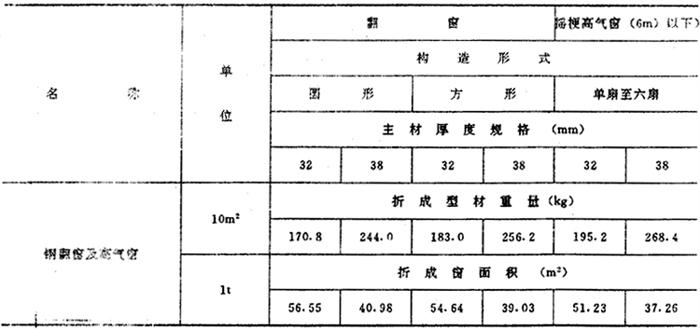 注:(1)圆形钢窗面积系按直径作正方形边长计算的面积。 (2)梗高气窗的重量未包括摇梗钢材重量。 |