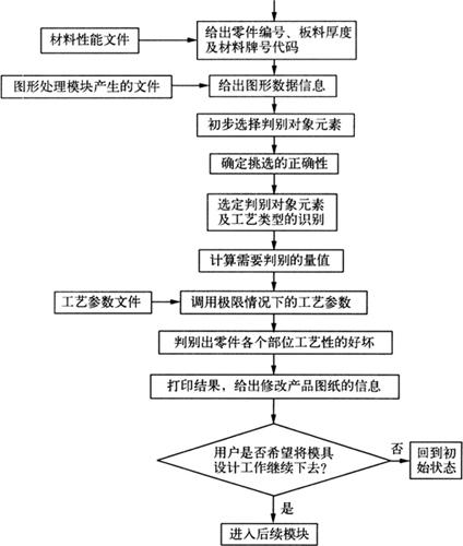 图1-22 电子产品外壳的成型 3.钣金件设计目标 通过使用Pro/ENGINEER Wildfire Sheetmetal钣金模块,可完成组合件中钣金零件的设计、成型状态或平整状态模型主体的设计,以及与钣金件相关的Wall(薄壁)、Bend(折弯)、Cut(切割)、Punch(冲孔)、Notch(切口)或Form(成型)等特征的设计。 在建立模型的平整状态时,利用变更Y-Factor来控制折弯的长度(developed length)。建立模型几何的平整阵列和平整状态,以反映制造和设计模型。并建立“折弯顺序表(Bend Table)”,以表示制造过程中使用的折弯顺序、折弯半径和折弯角。通过绘制平整模型和设计模型的产品图及“折弯顺序表”,以便记录设计过程。 4.使用限制 由于钣金特征是一套特别独立的特征,当零件被完全折弯到其设计状态或二者之间的任何阶段时,钣金件特征都可增加到钣金零件的加工过程中,并可在“Sheetmetal(钣金件)”模式下建立Datum(基准)、Cosmetic(装饰)及某些实体类特征,如Hole(孔)、Pipe(管)等。但不能在“Part(零件)”模式检索钣金零件,不能增加不适用于钣金件技术的“实体类”特征,如轴、扭转特征等。 (二)Solide Works钣金设计 Solide Works具有功能强劲、全相关的钣金设计和模具设计能力,以及从现有二维数据建立三维模型的强大转换工具及开放的二次开发工具,从而为用户进一步扩充和定制系统功能提供了方便,使用户可利用三维等工具进行产品开发、装配处理和复杂曲面造型等。 同时,Solide Works还提供了强大的基于特征实体的建模功能,用户可以通过拉伸、旋转、薄壁、抽壳、阵列及打孔等操作实现产品设计,还可方便地添加特征和更改特征,以及将特征重新排序、对特征和草图进行动态修改等,并通过拖拽等方式实现适时设计修改 在使用过程中,Solide Works能够直接读取DWG格式文件,在人工干预下将AutoCad的图形转换成Solide Works三维实体模型,使熟悉Windows的用户易懂易用,可将符合Windows标准的应用软件,集成到Solide Works软件中,从而为用户提供了一体化的解决方案。 在进行装配设计时,可以直接参考其他零件并保持这种参考关系生成新零件,动态地查看装配体的所有运动,并对运动零部件进行动态的干涉检查和间隙检测,还可以应用智能零件技术自动完成重复设计,运用智能化装配技术完成自动捕捉并自定义装配关系。 在进行工程图设计时,可以自动生成详细、准确的工程图样,该工程图是全相关的,即在修改图样时,三维模型、各个视图、装配体都会自动进行更新。 (三)冲压工艺CAE设计 CAE/CAM技术也已在板料冲压成型工序(如弯曲、胀形、拉深等)中得到了应用,尤其是应用在汽车覆盖件的成型中,给整个汽车工业带来了极为深刻的变革。利用CAE(其核心内容是有限元分析、模拟)技术,对CAD系统设计的覆盖件及其成型模具进行覆盖件冲压成型过程模拟,将模拟计算得到的数据再反馈给CAD系统进行模具参数优化,最后送交CAM系统完成模具制造。这样就省去了传统工艺中反复多次的繁杂的试模、修模过程,从而大大缩短了汽车覆盖件的生产乃至整个汽车改型换代的时间。 对于大型复杂冲裁件,利用CAD/CAE技术,可省去大型、复杂的模具,大大降低产品的成本。而且,操作时只要输入造型设计师设计的冲压件形状数学题型,计算机就会输出我们所需要的模具形状、板料尺寸、拉深筋及其方位和形状。 1.冲压工艺分析及选定 (1)冲压件工艺性分析:冲裁件、拉深件、弯曲件等均有不同的工艺可行性要求,在CAE系统中可采用扫描自动判别的方法或交互式查询等方法,也可用工艺性典型图通过人机交互完成此项工作,其工作流程如图1-23所示。