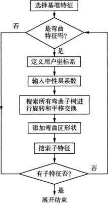 图1-23 工艺性判断流程 通常,在输入冲压件的图形数据、材料厚度及牌号代码等信息后,要判断需冲压对象的可行性时,须对整个图形进行搜索选择判别对象元素。 对于直线,是以某一端点为圆心、某一常数为半径作一辅助圆,进而判断辅助圆和除线段本身以外的所有图形元素,是否有交点或图形元素在辅助圆内,若有交点或在辅助圆内,则是判断对象元素。 对于圆元素,则是将其半径放大或缩小作辅助圆,求图形所有元素是否和辅助圆有交点或在其内,即可找到判断对象元素。但要注意到在有关系的元素间,可能有多余元素存在,须将其除去。 在找到判断对象元素以后,可利用事先确定的一套几何关系进而确定判断对象的性质,同时用解析几何的方法求出点与线间、线与线间、线与圆弧间以及圆与圆间的最小距离,从而进一步计算出需要判别的量值,并与允许的极限值进行比较。 (2)冲压工艺选定:冲压工序的安排、工序的组合,无论是单冲裁工序、复合冲裁工序,还是连续级进冲裁工序等,均属工艺方案选择中的问题,工艺方案关系到产品质量、生产率及成本等。多数采用人机对话方式,由用户根据本厂生产实际情况作出判断。 (3)冲压工艺计算: 1)毛料计算,如拉深毛坯下料尺寸及形状的确定、弯曲件展开尺寸计算、冲裁件毛料排样图的设计、各种方案中材料利用率的计算等。 2)工序计算,如拉深次数计算、拉深系数分配及过渡形状确定、弯曲件的先后弯曲、冲孔顺序、级进模的工步安排。 3)力的计算,如冲裁力、顶件力、卸料力、压边力的计算;在某些情况下,尚需计算成型中功率消耗的大小。压力机的选用,除根据计算对压力机的吨位、行程、闭合高度、台面大小等参数进行校核外,还需要查询工厂现有压力机型号的数据文件,然后根据工作任务忙闲程度确定。 4)模具工作部位强度校核,一般根据需要及实际情况确定,包括凸模失稳、凹模模壁强度等。 2.弯曲件毛坯展开 在进行冲压工艺CAE设计时,必须首先将弯曲件或拉深件等展开,然后再根据展开形成的弯曲件特征树,从基准特征开始搜索,遍历整个弯曲树,对每个弯曲特征子树进行展开计算,表示每个弯曲面的展开过程。弯曲面展开是以弯曲的主平面为基准,将弯曲区展开成平面,与弯曲面相连的所有特征子树必须作旋转变换。 弯曲件展开后,各个特征之间的相互连接关系不变,因此可复制出弯曲件的弯曲树,形成展开树,如图1-24所示。