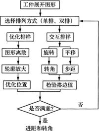 图1-24 弯曲件自动展开流程 由于展开过程是弯曲成型的逆过程,弯曲区的尺寸与金属材料的厚度及工艺有关,因此很难准确计算出展开尺寸,只能凭经验采取中性层系数的方法确定展开尺寸。 3.冲压件毛坯排样 由于在毛坯排样中,不仅要考虑材料利用率,还要考虑条料的轧制方向对内弯曲区的影响,以及载体方式和条料强度,所以CAE系统毛坯排样是自动优化排样和交互排样相结合的过程。 自动优化排样仅从材料利用率角度出发,采用高度函数法,计算出材料利用率最高情况下的图形排列方式。其结果须通过交互式排样进行调整、修改,并利用存放在Blay数据结构中的排样参数,对冲压件展开图形动态平移和旋转,达到改变步距和图形转角的目的,还可由菜单功能选择单排或双排方式排样,如图1-25所示。