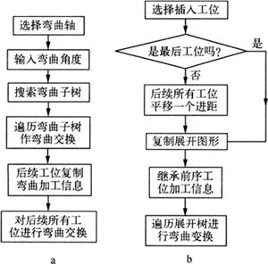 图1-25 毛坯排样流程 4.弯曲工序设计 按照毛坯排样的结果将零件展开图复制到指定的工位,并继承已设计的排样工序,采用交互式方法在任意工位设计弯曲工序,制定弯曲角度。在弯曲变换中,弯曲面上的子特征及相邻特征及后续各工位也应作相应的变换(图1-26a)。