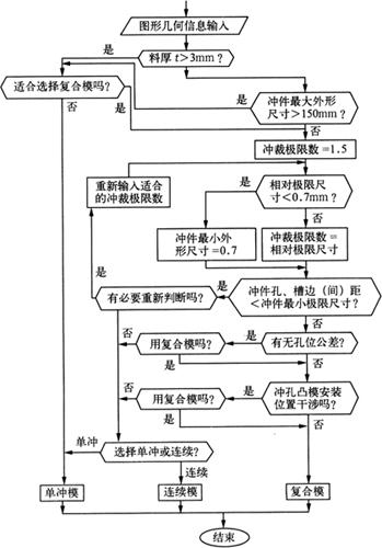 图1-26 弯曲工序与添加工位设计 a.工序设计流程 b.添加工位流程 由于弯曲过程是零件展开的逆过程,所以图形变换、绘图及计算的具体操作参见毛坯展开,并要考虑弯曲中的干涉、回弹等,可通过三维图形显示检查及计算,还可根据排样工序的需要,不断添加工位,如图1-26b所示。 5.冲裁工艺CAE方案选择 (1)冲裁工艺方案选择:由计算机判断选择冲裁工艺方案时,必须首先根据生产中的实际经验,总结出工艺方案选择的判据,建立类型选择设计模型,如图1-27所示。
