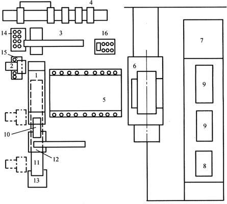 图1-15 冲孔-弯曲FMS结构 1.压力机 2.搬送机器人 3.坯料供给装置 4.料垛托架 5.换模装置 6.吊车 7.模具库 8.放置台 9.存放架 10、11.运送装置 12.工件托架 13.废料托架 14、15.操作盘 机器人用于上、下料,其活动度为4,最大合成速度为2.25rn/s。坯料供给装置将装载料垛托架上的板料送至机器人的吸料位置;每个托架上可堆放6垛板料,每个堆垛处都有升降机构,以保证机器人的吸盘能吸到板料。用吊车将仓库中的模架运到换模装置上,再用此装置将模架搬送到压力机上装好。工作台上用过的模架也可按相反的过程送回仓库的架子上。 这种FMS的控制部分是一种分级控制系统,其原理如图1-16所示,各装置既有相应的控制器,又可在主计算机的指挥下进行信息交换,并实现总体控制。该FMS由日本小松和芝浦电气公司研制,主要用于加工强电控制器的零件,适用于批量为20~400个的零件,工序种类包括冲孔、修边、精压和弯曲,且工序数量为1~3个工序的生产。