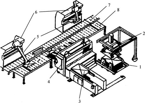 图1-19 机器人工作原理 a.手臂和示教臂 b.控制线路 图1-19b是这种机器人的控制线路图。机器人的所有机械运动均用直流伺服电机驱动,并经谐波减速器减速,所用控制计算机为SBC11/21型。 (三)冲孔-步切FMS 图1-20所示为美国Widemann公司研制的DNC System1000型配电面板FMS的结构,由直角剪板机、冲模回转头压力机、物料输送机构、料仓和控制等部分构成,可加工的面板最大尺寸为1219mm×3658mm×4.76mm。