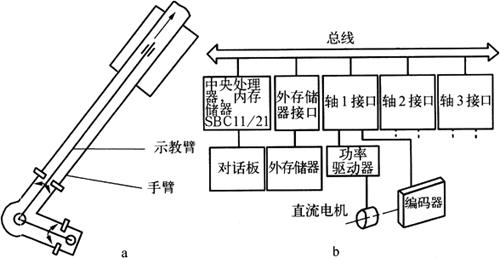 图1-18 折弯机器人和折弯机 A.旋转手臂 B.伸缩手臂 C.手腕 D.手抓 (1)手臂A旋转运动的转动范围为70°,速度为115°/s。 (2)手臂B伸缩运动的活动范围为1.2m,速度为1.6m/s,加速度为2m/s2。 (3)手腕C旋转运动的转动范围为180°,速度为286°/s。 (4)手抓D旋转运动用于板料翻面,其转角固定为180°。 折弯机器人能完成比较复杂的动作,如将板料送入上、下模之间,并将其推靠在折弯机的后挡料装置处,在折弯过程中跟随板料一起运动,且能承受较大的力矩,以防止板料出现不符合要求的弯曲缺陷。 折弯机器人的手臂中还设有示教臂,如图1-19a所示。操作者用手推动示教臂,可借助直接模拟电路,使机器人的手臂跟随示教臂运动,并用与机器人各种动作相连的编码器记录其运动轨迹。当转换成自动工作时,机器人手臂能按照事先示教的位置及顺序自动运动。