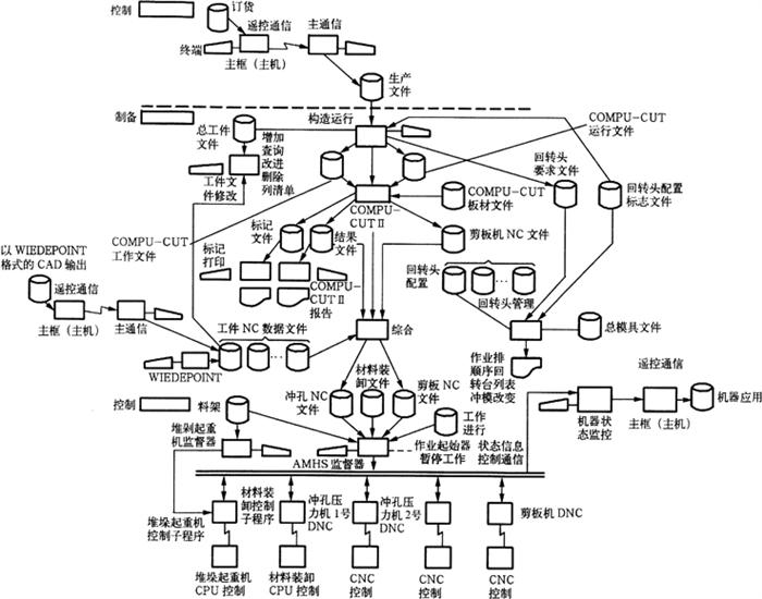 图1-21 冲孔一步切FMS分级控制原理 FMS本身的计算机是16~32bit的小型或超小型计算机,具有1MB以上的随机存取储存器(RAM),以及大于50MB的磁盘。外部设备通常有两个以上的打印机(其中一个在机器上,另一个在计算机房内)、两个以上的CRT(显示器)(其中一个为图形终端)、一台自动绘图机和一台备用磁带记录仪。 (2)分级控制文件:在其控制级中,每一台机器用一单独的CNC或PC控制。各个“工件的NC数据文件”又构成“总的NC数据文件”,以建立排样程序“COMPU-CUT”,并显示于CRT上或用自动绘图机绘出。 “COMPU-CUT”的输出建立“剪切NC文件”和“结果文件”,并与“工件NC数据文件”相结合,构成“综合程序”。且每个“工件的NC数据文件”被转换成每个工件孔的位置、冲孔和切割的顺序、轨迹,并形成“冲孔NC文件”和“剪切NC文件”(包括剪板与切割),再将两个文件与“板材装卸文件”一起输入自动板材装卸监督器(AMHS),以使堆垛起重机、板材装卸装置、冲模回转头压力机和剪板机等的控制相协调。 4.分级控制工作原理 冲模回转头压力机开始工作前,AMHS向堆垛起重机监督器(SCS)发出一请求信号,以便检查板材的可用性。若系统中没有足够的板材,将在车间的CRT上通知操作者,并紧急停止系统工作。 系统开始工作时,AMHS又向堆垛起重机控制子程序(SCCR)发出一请求信号,以便堆垛起重机能从料仓获得板材,并通过板材装卸控制子程序(MHCR)控制装料移动台移至其装料位置。当板材装至移动台后,该台将移至前端卸料位置,随之升降装料器、冲模回转头压力机等将相继开始工作。 当装料移动台上的板材耗尽时,MHCR将使移动台回到其后端装料位置,并通知AMHS材料已用完,于是AMHS向SCCR提出两个请求,一要求将空料架入库,二要求一个满料架;当空料架入库后,装料移动台从堆垛起重机上接受一满料架并移至其前端卸料位置,系统继续工作。 当系统运行完成后,AMHS将通过MHCR使装料移动台移至其后端装料位置,并同时向SCCR发出一请求,命令堆垛起重机将未用完的料架送回料仓。板材装卸CPU(中央处理器)控制器(MHCC)能协调各级硬件的运行。 |
