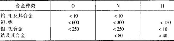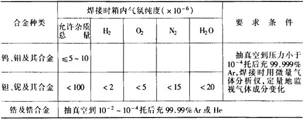 注:钼及钼合金酸洗后放入1000ml水中加入12g铬酸、3ml/H2SO4的溶液中浸泡后再用水冲洗。 (3)箱内钨极弧焊时对箱内的气氛纯度要求见表10-95。焊接工业纯烧结钼薄板(0.3mm)时,箱内充Ar+5%H2混合气,焊接接头可获得较好的室温塑性。 表10-95 箱内钨极弧焊时对保护气氛的纯度要求
