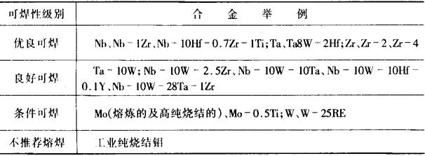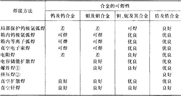 2.焊接方法的选择(表10-92) 表10-92 钨、钼、钽、铌、锆及其合金采用不同焊接方法时的可焊性