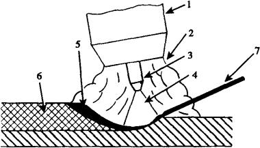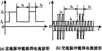 图6-2 钨极氩弧焊示意图 1-焊枪;2-保护气;3-钨极;4-电弧;5-液态焊缝金属;6-固态焊缝金属;7-填充丝 钨极氩弧焊能清晰地观察到焊接熔池和熔透情况,焊接过程不发生飞溅,焊缝成形美观,焊缝无渣壳,不需要清理。在焊接电流很小的情况下,电弧仍可稳定燃烧,因此钨极氩弧焊特别适合焊接薄件。在要求保证焊透及背面有一定成形要求的情况下,常用钨极氩弧焊单层焊或多层焊第一层打底焊,背面用氩气保护,可实现单面焊双面成型。钨极氩弧焊可进行全位置焊接,特别适合各个空间结构的装配和连接焊缝的焊接。由于钨极氩弧焊效率低,不适宜厚板的焊接,钨极氩弧焊接头的热影响区较宽、冷却速度较慢,焊缝及热影响区冷却过程中敏化温度区间停留时间较长,接头的耐腐蚀能力有所下降。 在钨极氩弧焊的工艺基础上,开发的钨极脉冲氩弧焊是通过控制电流周期性脉冲变化来控制焊接过程(图6-3)。其原理是以一个较小基值电流来维特一个电弧,在此基础上,周期性地加一个高峰脉冲电流产生脉冲电弧,以熔化金属并控制熔滴过渡。钨极脉冲氩弧焊的优点在于它可以精确地控制焊接热输入,克服了因熔敷金属表面张力不足支持熔池而造成焊缝的下塌,保证连续焊接,可以实现单面焊双面成形,保证焊缝质量,特别适合薄板的焊接;其次它的焊缝成形美观、质量稳定,它对各种焊接位置有较强的适应性,适用于全位置的焊接。根据脉冲频率不同,可分为低频和高频脉冲钨极氩弧焊。