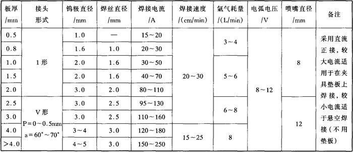 图6-3 钨极脉冲氩弧焊电流波形 Ip-直流脉冲电流;ip-交流脉冲电流幅值;Ib-直流基值电流;ib-交流基值电流幅值;tp-脉冲电流持续时间;tb-基值电流持续时间 钨极氩弧焊设备由焊接电源、引弧及稳弧装置、焊枪、供气系统、水冷系统和焊接程序控制装置等部分组成。焊接电源必须是降特性。现在一般有专用氩弧焊机把焊接电源、水冷系统和焊接程序控制装置等合并在一起,满足钨极氩弧焊焊接工艺要求。它一般具有提前送气、延迟停气、自动接通和切断保护气以及引弧、稳弧等功能,另外焊接结束前电流还能自动衰减,以防止弧坑开裂。氩弧焊机又分为直流和交流氩弧焊机,不锈钢焊接一般采用直流氩弧焊机。供气系统包括氩气瓶、减压器和流量计,焊枪根据适用的焊接电流大小分为水冷式和气冷式两类。目前使用的钨极有纯钨极、钍钨极和铈钨极,其中最常用的是铈钨极。钨极直径的选择根据工件的厚度和填充焊丝的直径等。钨极的端部要磨成一定形状,通常磨成带有平顶的锥形。 由于氩弧焊主要用于薄板焊接或封底焊,在保证焊透的情况下焊接薄板常常不用开坡口。在一定厚度如≥2mm时,可根据情况开V形、U形坡口。氩气的纯度一般要求大于99.7%。氩气的流量要合适,过小保护不佳,流量过大可能要造成气体紊乱,也造成保护不好。焊接电流要根据工件厚度、接头的形式、焊接位置来选择同时必须考虑钨极的直径。焊接极性采用工件接正极(即直流正接),手工氩弧焊常见焊接参数见表6-2。钨极氩弧焊的引弧方法有非接触和接触式引弧两种,非接触式有变频引弧和高压脉冲引弧,接触式有擦划引弧和提升引弧。不锈焊材时主要采用非接触式方法引弧。 表6-2 用手工操作钨极氩弧焊焊接奥氏体型不锈钢时的焊接参数