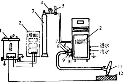 图5-12 手工氩弧焊设备系统示意图 1.焊接电源 2.控制箱 3.氩气瓶 4.减压阀 5.流量计 6.焊接电缆 7.控制线 8.氩气管 9.进水管 1O.出水管 11.焊枪 12.工件 这种焊机主要用于铝镁及其合金的焊接。配用BX3-1-500型动圈式弧焊变压器为焊接电源。为适于氩弧焊需要在控制箱内装有隔直电容、脉冲引弧器、脉冲稳弧器、交流接触器、延时继电器、电磁气阀等。面板上装有电流电压表、电源水源指示灯、气流检测和粗调气体延时开关等。配有500A、380A、150A三种型号的焊枪。NSA-500-1型焊机的工作原理见图5-13。