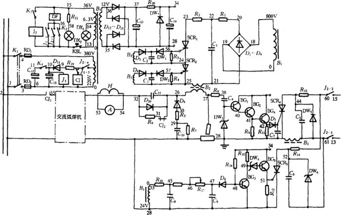 图5-13 NSA-500-1型钨极手工氩弧焊机电路原理图 (1)焊接主电路:弧焊变压器向电弧供电。脉冲变压器B2的次级绕组,将引弧和稳弧脉冲叠加在电弧两极之间。高压脉冲傍路电路由D9、R5、R7、C10组成。D9只允许正向脉冲通过,可防止脉冲电流产生振荡,提高引弧可靠性。C10防止低频电流通过。R7是C10的放电电阻,R5保护D9。消除直流分量电路由C11、D10、R6组成。D10保证引弧电压不下降,R6停机时使C11放电,防止带电危险。 (2)高频脉冲发生电路:由控制变压器B1次级获800V电压,经D1-D4整流、R1、C1滤波可得到1120V左右高压,当SCR1、SCR2同时打开时,C1通过B2放电,在B2次级产生2~3kV的高压高频脉冲。高频脉冲加在工件和钨极之间起引弧或稳弧作用。 (3)引弧电路:图5-13右下方,控制信号取自变压器B1次级24V绕组,经R18、C5和R15、R17、C9移相90°后,通过BG3、BG5使SCR5导通,C6向B3放电,B3次级脉冲使SCR1、SCR2开通,在B2次级产生一高压引弧脉冲,此时正处在焊接空载电压负半波极大值,在负半波极大值的基础上叠加一个高压脉冲,起到了引弧作用。 (4)稳弧电路:图5-13中右方,控制信号取自电弧电压,经R8、C4、DW3衰减后,通过BG1、BG2、BG4使SCR44导通,C5向B3放电,B3的次级脉冲使SCR1、SCR2开通,在B2次级产生一高压稳弧脉冲,此时正处在焊件由正极性向负极性转变,焊接电流过零的瞬间。起到了稳弧作用。 该电路设计能保证空载时,只有引弧脉冲,而不产生稳弧脉冲,电弧一旦引燃,即产生稳弧脉冲,而引弧脉冲自动消失。原因是空载时,钨极与工件之间是焊接电源空载电压,与向C5充电的36V电压同相位,当SCR4导通时,C5尚未充电,故稳弧脉冲触发电路空载时不起作用。引弧后钨极与工件之间为电弧电压,比空载电压滞后70°左右,当SCR4触发时,C5已充上了足够的电压,故可以通过B3放电,使SCR1、SCR2导通,产生高压稳弧脉冲。但引弧后虽然在电源电压处在90°时,可以产生引弧脉冲触发信号,但由于C1刚放完电,还没来得及充上足够的电压,不可能再产生足够高的引弧脉冲。 3.钨极氩弧焊机的技术参数 表5-21 典型通用钨极氩弧焊机技术数据