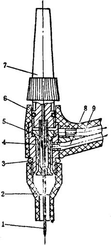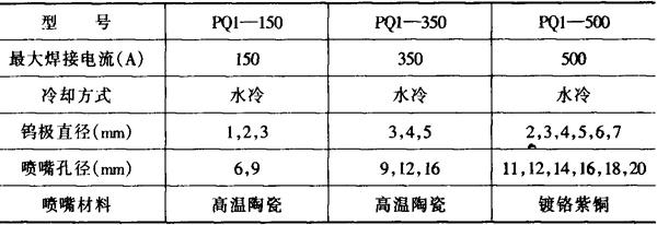 图5-14 PQ1-150水冷式焊枪结构图 1-钨极 2-陶瓷喷嘴 3-密封环 4-轧头套 5-电极轧头 6-枪体塑料压制件 7-绝缘帽 8-进气管 9-冷却水管 (3)PQ1型手工钨极氩弧焊枪技术数据 表5-26 PQ1型手工钨极氩弧焊焊枪技术数据