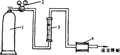图5-15 TIG焊供气系统示意图 1-高压气瓶 2-减压阀 3-流量计 4-电磁气阀 (2)流量计刻度的标定:浮子流量计刻度读数每分钟多少升,是用空气标定的。所以测量其他气体流量时,实际流量应按刻度读数进行换算,换算的公式如下: