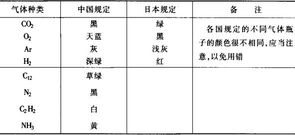 式中 Q实——被测气体的实际流量(L/min); Q空——浮子流量计的读数(L/min); γ浮——浮子材料密度(g/cm3); γ实——被测气体的密度(g/cm3); γ空——原标定的空气密度(g/cm3)。 (3)不同气体规定的气瓶颜色 表5-27 不同气体的气瓶颜色规定