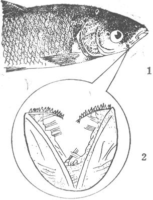 图24 钩介幼虫病 1.病鱼 2.钩介幼虫 |