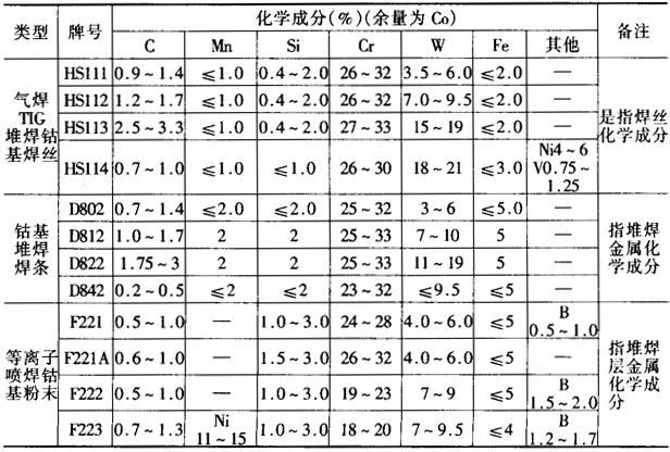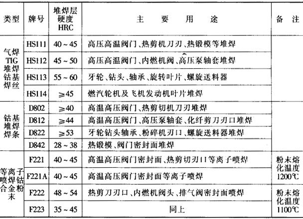 钴基堆焊合金是钴、铬、钨合金,也称斯太立特合金。含C0.7%~3.3%,含Cr25%~33%,含W3%~21%。堆焊层是奥氏体+共晶组织。含碳量增高共晶组织增多。最终可获得共晶体+合金碳化物M3C3、M6C组织。它的高温抗蠕变能力高于现有任何堆焊金属。温度大于650℃时仍能保持较高的强度和硬度,有-定的抗腐蚀能力,具有优良的抗粘着磨损性能。随着含碳量的增加生成Cr7C3使它具有优良的抗磨料磨损性能。钴基堆焊合金的成分见表9-22,硬度和用途见表9-23。